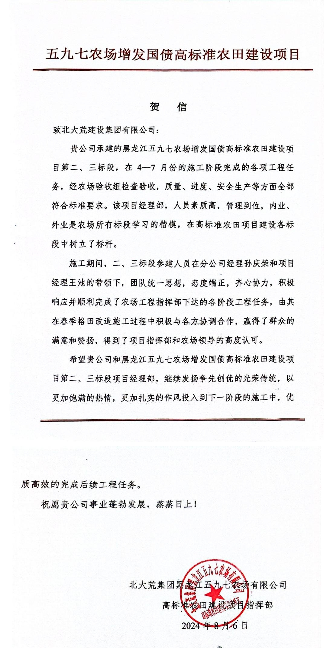 近日,北大荒建設(shè)集團(tuán)有限公司第二分公司黑龍江五九七農(nóng)場(chǎng)增發(fā)國(guó)債高標(biāo)準(zhǔn)農(nóng)田建設(shè)項(xiàng)目二、三標(biāo)段收到了來自北大荒集團(tuán)黑龍江五九七農(nóng)場(chǎng)有限公司高標(biāo)準(zhǔn)農(nóng)田建設(shè)項(xiàng)目指揮部的賀信。